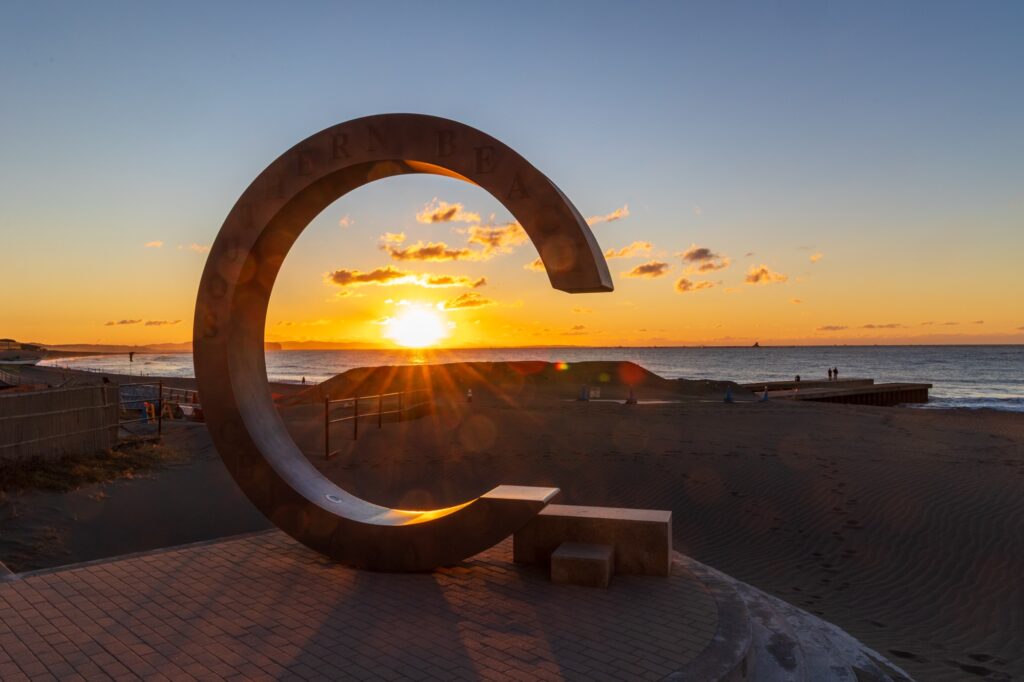 【神奈川・茅ヶ崎/日の出】サザンビーチちがさき|真冬の澄んだ空気の中、相模湾へ出る大きなオレンジ色の日の出はまさに絶景【神奈川県・茅ヶ崎市】[絶景File No.124]